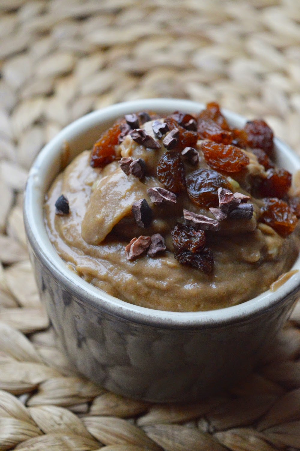 krem z awokado, bananami, karobem, maca, surowym kakao i rodzynkami