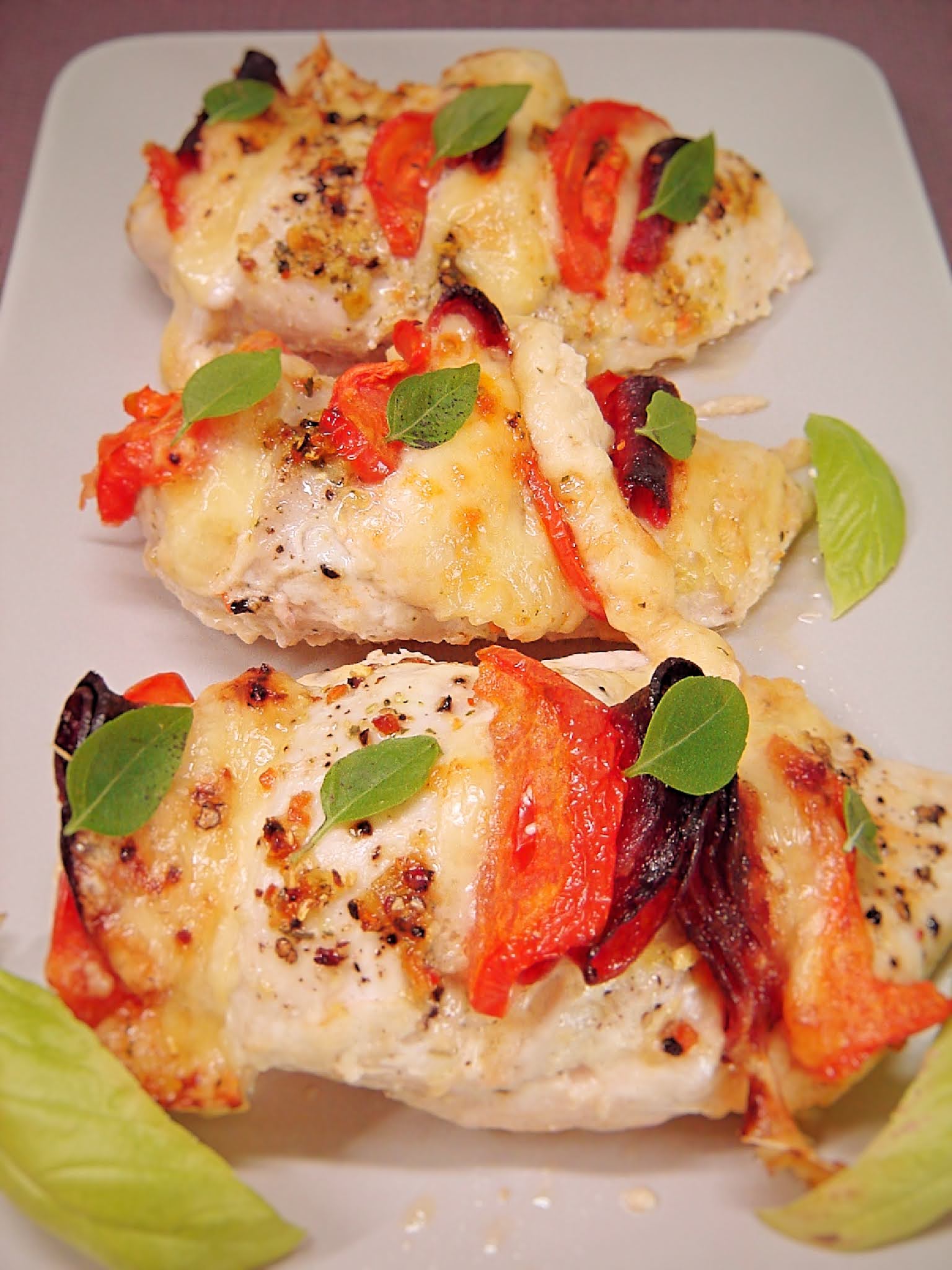 Piersi z kurczaka zapiekane z serem żółtym, salami i pomidorem