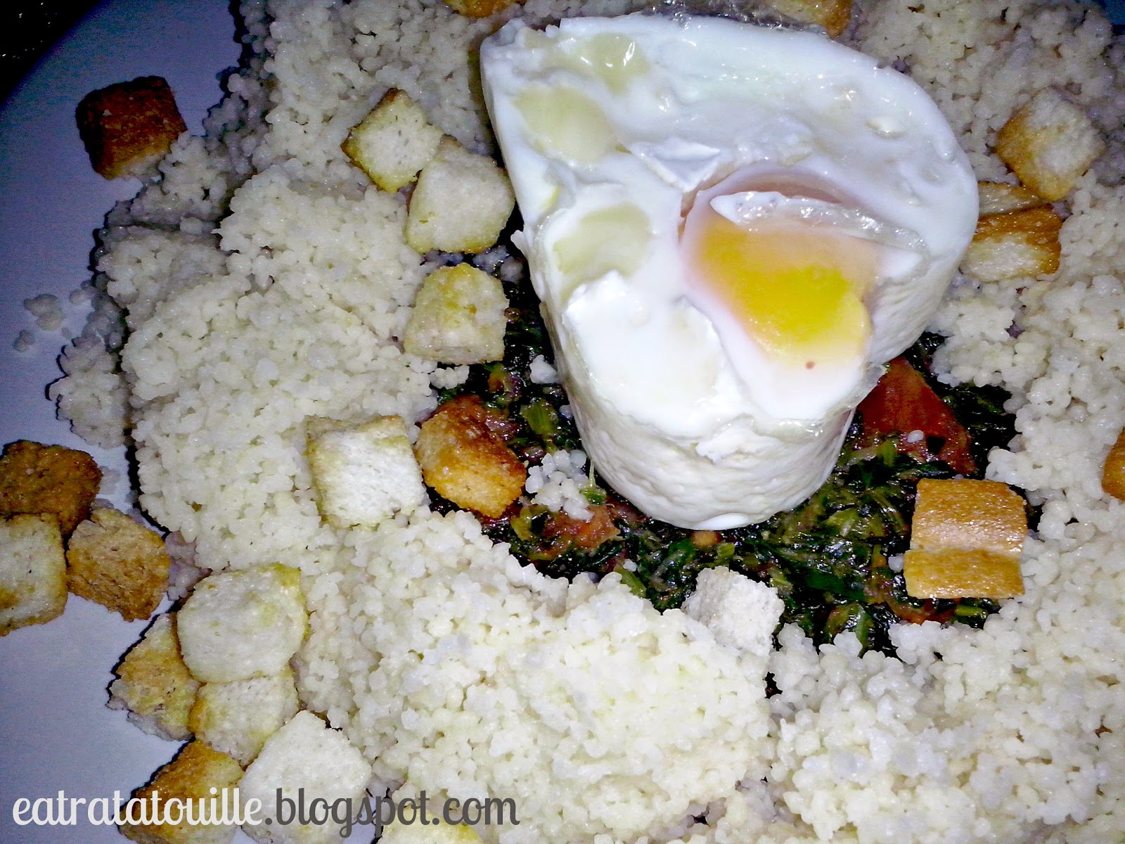 1 jajkoporcja szpinaku mrożonegopomidorczosnek1/4 szklanki kaszy kuskusgrzankiser pleśniowy (dla odważnych)przyprawy do smakułyżka oliwy z oliwek