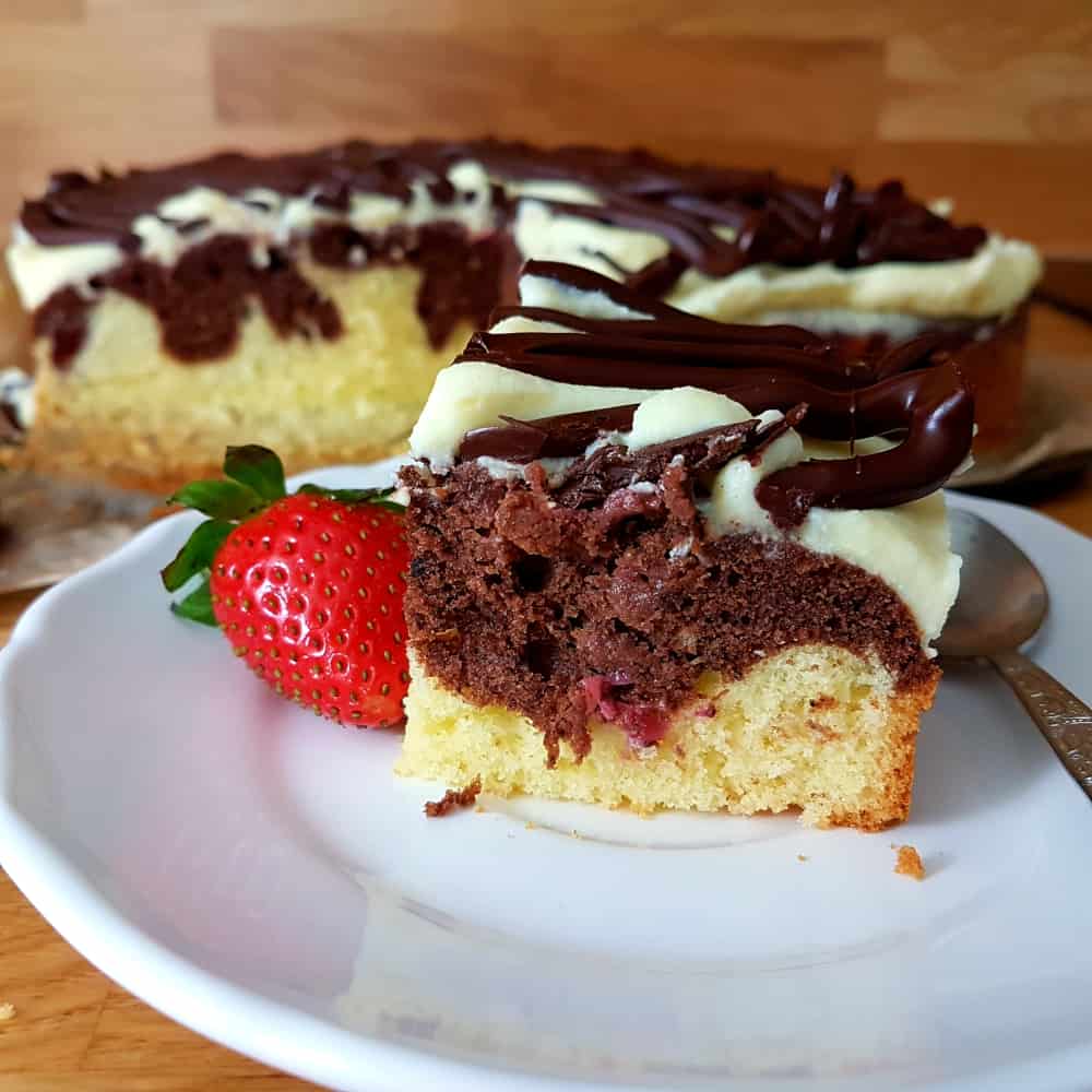 Przepis na pyszne ciasto Fale Dunaju z truskawkami. Ciasto przełożone jest masą…
