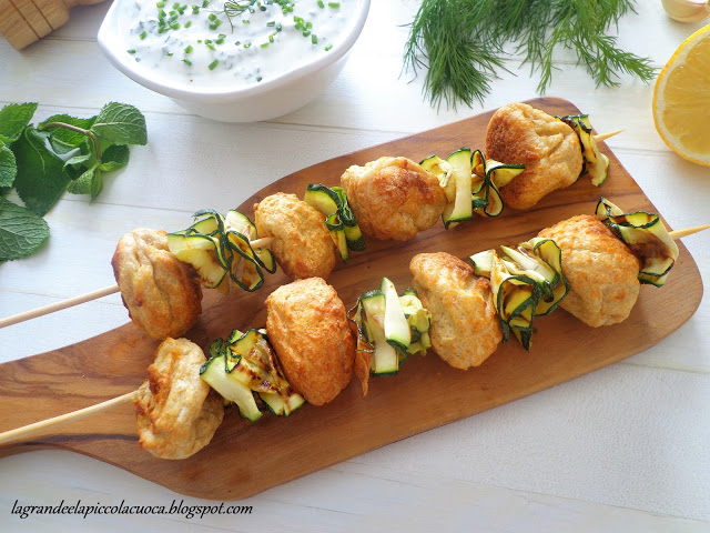 Szaszłyki z pulpecikami z kurczaka, grillowaną cukinią i dipem jogurtowo-ziołowym (Spiedini di polpettine di pollo con zucchine grigliate e salsa di yogurt alle erbe aromatiche)
