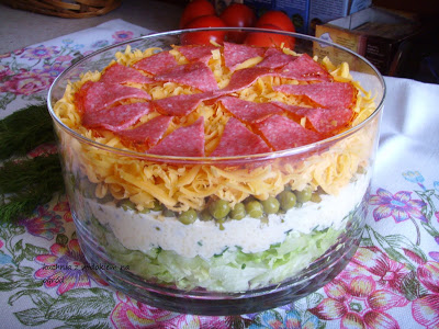 Sałatka siódemka. Sałatka warstwowa z selerem naciowym i salami.