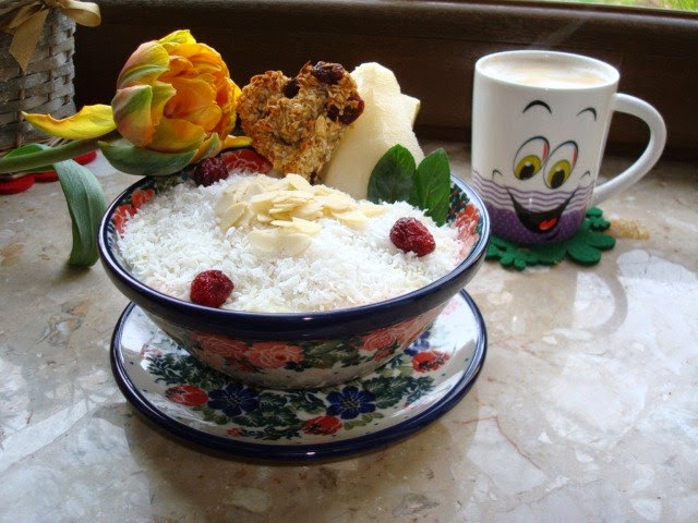 Kasza jaglana z wiórkami kokosowymi, żurawiną, gruszką i płatkami migdałów