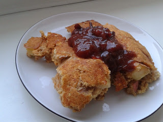 wegański owsiano-jaglany omlet cesarski z rabarbarem i jabłkiem, podany z domowymi powidłami