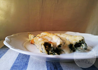Składniki:- 450g mrożonego szpinaku- 150g makaronu cannelloni- 6 pomidorów suszonych z zalewy- 4 ząbki czosnku- 200g sera feta/sałatkowego- niewielki kawałek dowolnego sera żółtego- 1½ szklanki mleka- 3