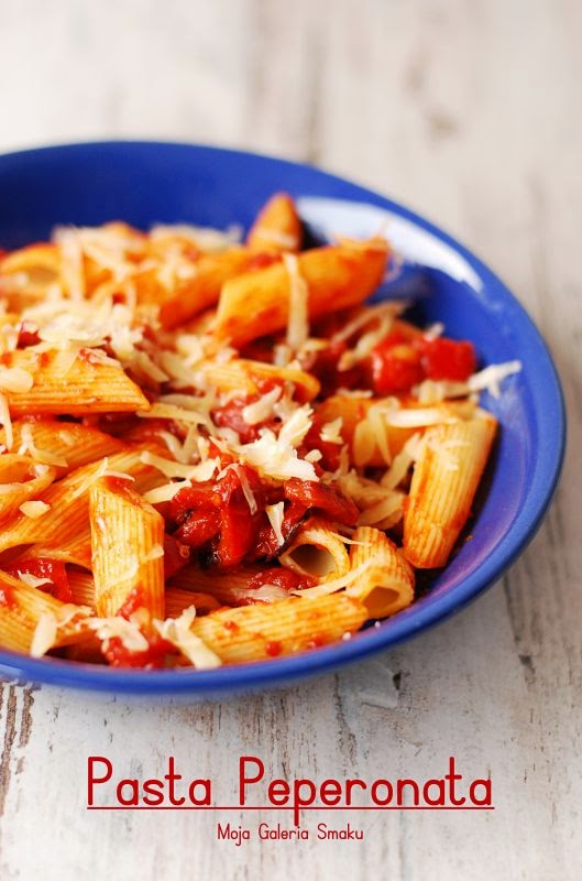 Składniki:2 papryki1-2 łyżki oliwy2 ząbki czosnku250 g makaronu penne1 puszka pomidorówniecała łyżka czerwonego octu winnegoparmezansól, pieprz