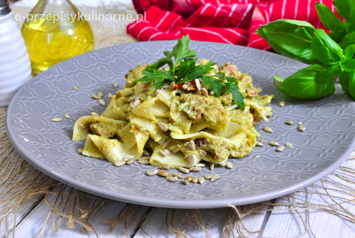 Makaron z boczkiem w sosie brokułowym z suszonymi pomidorami i czosnkiem to…