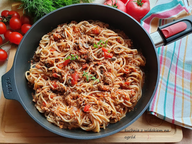 Spaghetti z mięsem mielonym, pieczarkami i pomidorami to doskonała propozycja na szybki,…