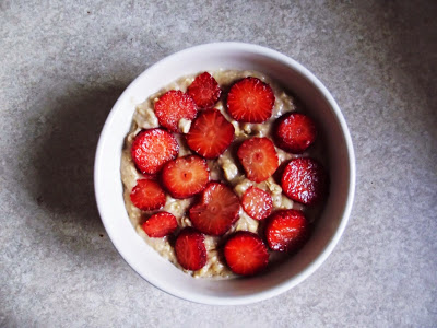 owsianka z siemieniem lnianym, serkiem czekoladowo-orzechowym, bananem i truskawkamiporridge with flaxseed, chocolate-nut cream, banana and strawberries