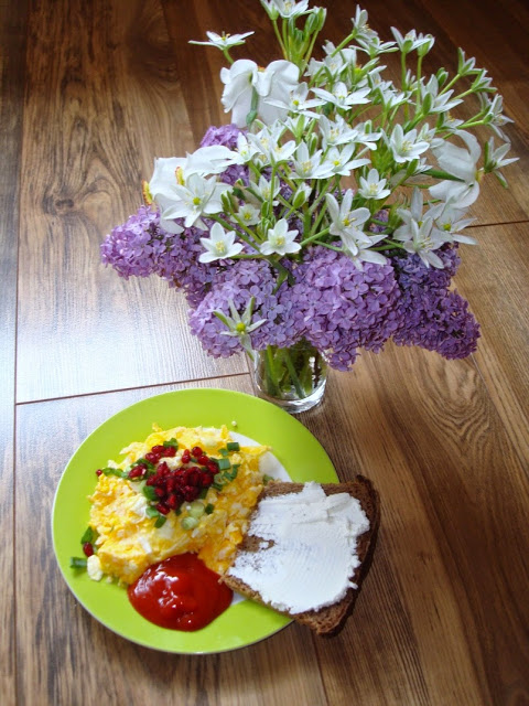 Jajecznica, granat, szczypior i chleb z „Moim ulubionym”