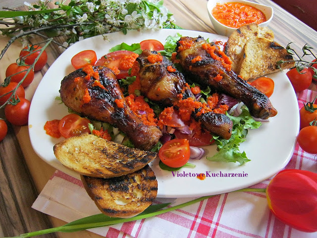 Zdrowe mięsko z kurczaka w rewelacyjnej słodko-kwaśnej marynacie. Smaki idealnie się przenikają. Do tego dip paprykowy i grzanki. Obiad idealny na świeżym powietrzu.