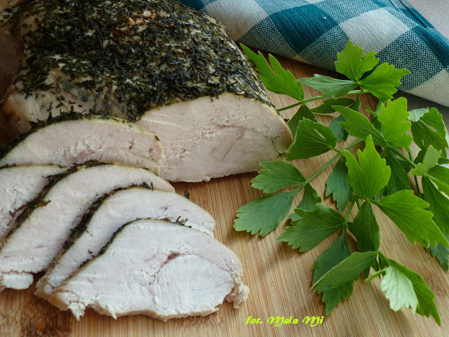 Kolejna propozycja pysznej wędlinki dla najmłodszych pociech – nie słona, aromatyczna, w sam raz na kanapeczki malucha 🙂 dla dorosłych należałoby bardziej posolić wodę, w której mięso się moczy.