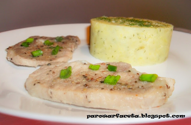 2 plastry schabusok z 1/2 cytryny 3 ziemniaki szczypiorek2 łyżeczki żurawiny w miodzie Przyprawy :