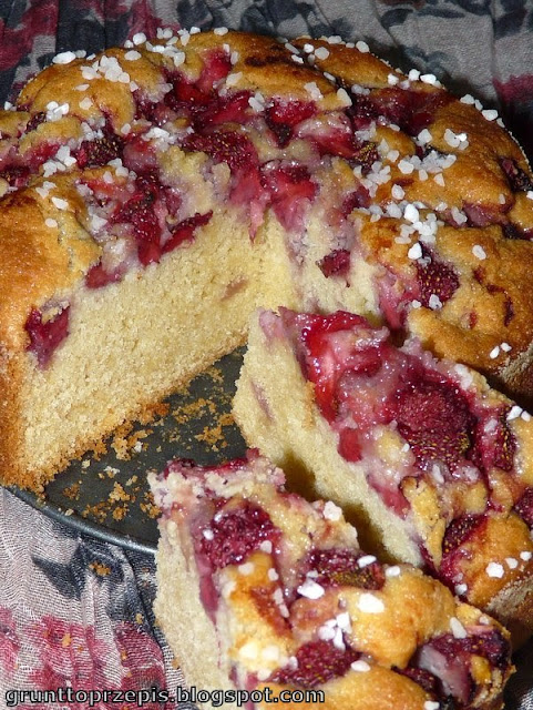 Skusiły mnie pierwsze, dostępne w osiedlowym warzywniaku, polskie truskawki. Może nie tak piękne, błyszczące i dorodne jak te importowane, ale na pewno zdrowsze i mniej sztuczne w smaku. Postanowiłam wykorzystać je w szybkim i łatwym do przygotowania, ale jakże smacznym cieście owocowym.
