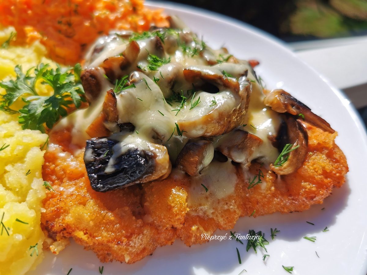 Marynowany w mleku kotlet schabowy z pieczarkami i serem