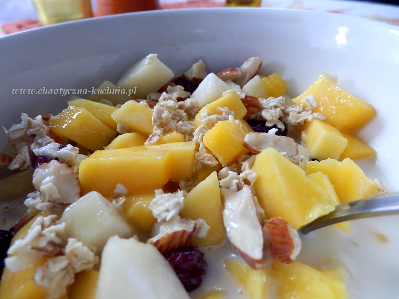 Domowa granola bananowo-kokosowa podana z jogurtem, mango, kiwi, malinami, borówkami i cynamonem