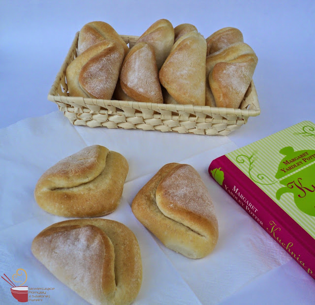 Przepis pochodzi ze świetnej książki Margaret Yardley Potter: „Kuchnia prababci”. Jej recenzja wkrótce pojawi się na blogu, a tymczasem zapraszam do przygotowania tych niezwykle smacznych i chrupiących bułeczek 🙂 Mają nietypowy kształt i świetnie sprawdzą się m. in. jako dodatek do grilla 🙂