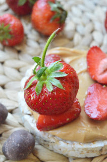 wafel ryżowy z masłem orzechowym, truskawkami, i bananami w surowej czekoladzie