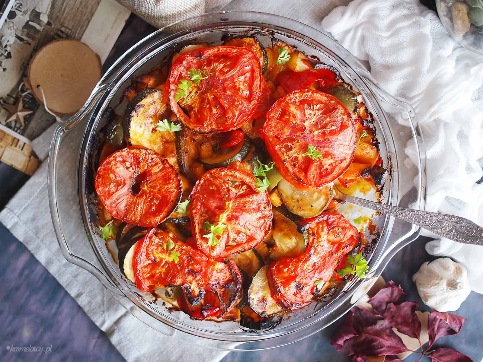 Pierś z kurczaka zapiekana z pomidorem, cukinią i mozzarellą