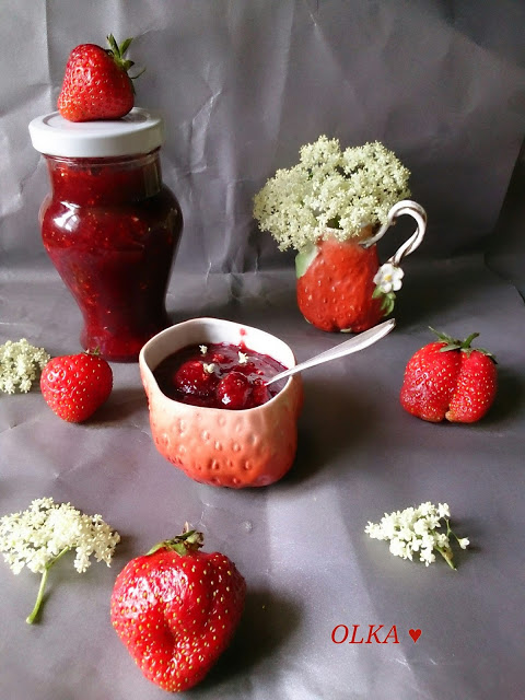 Witajcie 🙂 idąc za ciosem zapraszam na kontynuację kuchni kwiatowej z użyciem kwiatów czarnego bzu i przedstawiam dżem truskawkowy z kwiatkami z bzu czarnego. Ameryki tu nie odkryłam, bo połączenie to od dawna funkcjonuje na blogach i co sezon pojawia się na nowych. Ktoś pewnie był pierwszy ale