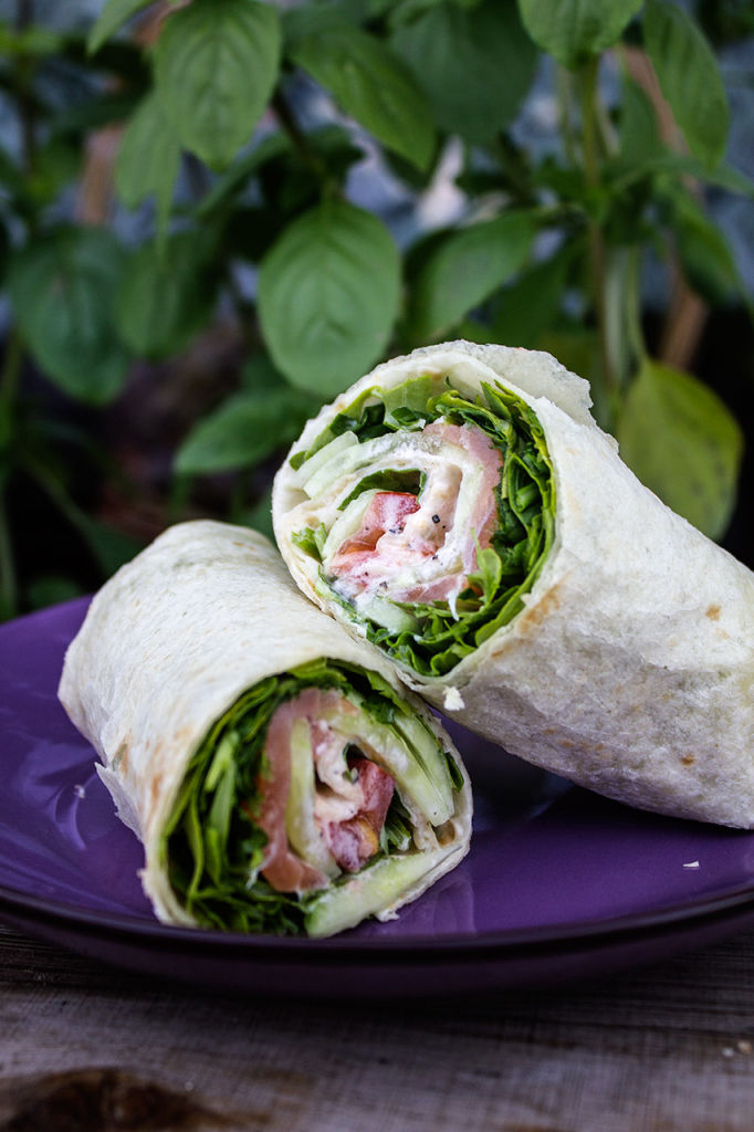 Placki tortilla z wędzonym łososiem, rukolą, pomidorem i ogórkiem. Są świetną przekąską do zabrania ze sobą z domu np. do szkoły, na piknik czy do pracy.