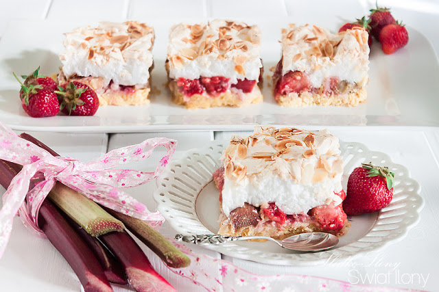 To ciasto jest tak pyszne, ze aż brak mi słów 😉 Najlepsze kruche ciasto z dużym dodatkiem mąki ziemniaczanej, której zawdzięcza swą idealną strukturę, do tego soczyste truskawki i rabarbar oraz ogromna ilość przepysznej bezy – miękkiej w środku i pięknie