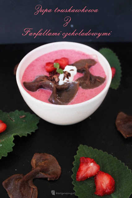 Pyszna zupa na chłodne dni z czekoladowymi kokardkami. Wygląda ślicznie i jest szybka w przygotowaniu, a do tego jest swoistą bombą witaminową. Jest doskonała dla większych i mniejszych łasuchów, Do dzieła, gotujemy 🙂