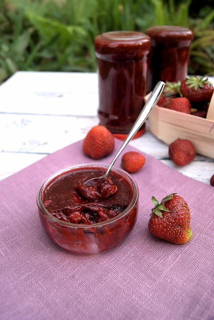 Dziś chciałabym Wam polecić pyszne konfitury z truskawek i bananów z dodatkiem czekolady lub kakao. Znakomity dodatek do bułeczek śniadaniowych, gofrów, twarożków, jogurtów lub deserów. Po kilku minutach gotowania można się cieszyć pysznym i aromatycznym smarowidłem, i trudno się powstrzymać żeby nie wyjadać go łyżeczką wprost ze słoiczka :).