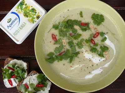 500 g cukinii2 ząbki czosnku1 nieduża cebula0,5 litra wodykostka rosołowa40 g kremowego serka Arla Apetina pesto i rukola1 papryczka chillikilka liści kolendrygarść orzeszków ziemnychsól i pieprz Cebulę i czosnek drobno posiekaj. Cukinię obierz ze skórki
