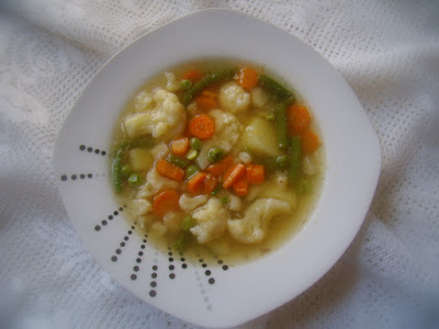 1 mały kalafior4 średnie marchewki1/4 selera1 pietruszka3 ziemniaki200 g fasolki szparagowej (u mnie mrożona)150 g groszku cukrowego (mrożony)