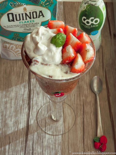 Czekoladowy pudding z ekologicznych płatków quinoa z kandyzowanym imbirem bio (Ginger Party) na wodzie kokosowej bio (do kupienia TUTAJ) podany z mascarpone, truskawkami i białą czekoladą