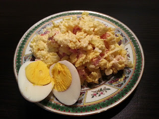 Dziś proponuję sałatkę z makaronem o niewielkich kształtach z dodatkiem wędzonej piersi z kurczaka i pysznym