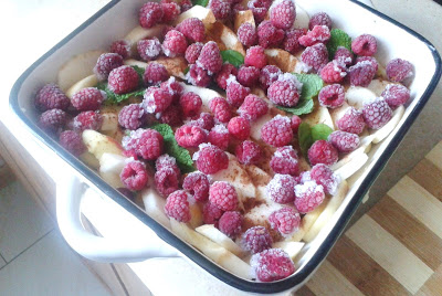 Pyszny nie tylko letni , ale na każdą porę roku owocowy deser pod kruszonką. Ja przygotowałam go z chęci pozbycia się jabłek, których mam w nadmiarze, a przy okazji użyłam malin z zeszłego sezonu, które jeszcze czekają na zjedzenie w zamrażarce. Tu za chwile będą już świeże, więc trzeba się