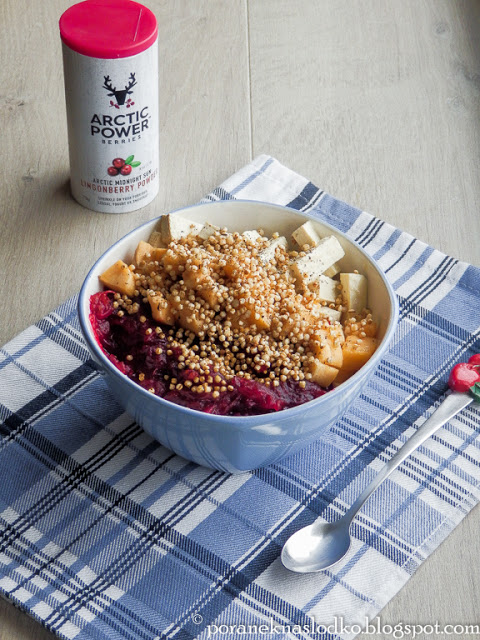Kasztanowy krem z pszenicy płaskurki (farro) podany z duszoną z syropem klonowym…