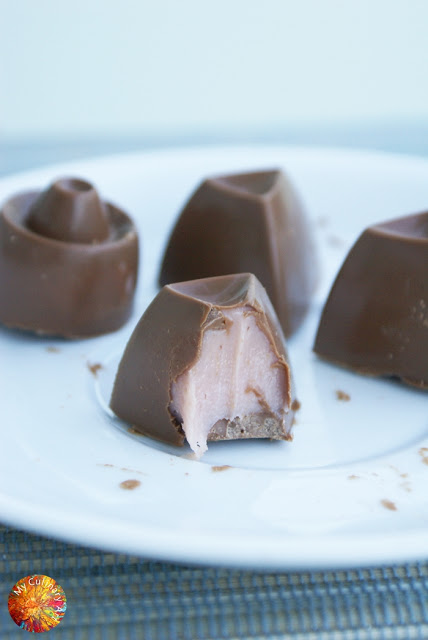 Składniki na 24 pralinki:150 g truskawek1 łyżka cukru1/2 łyżki wódki45 ml śmietanki kremówki (3 łyżki)200 g białej czekolady175 g mlecznej czekolady