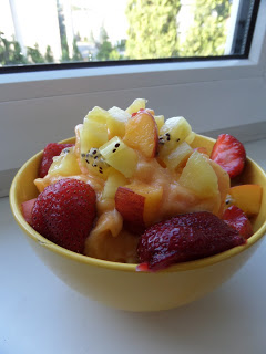 lody banan-melon-mango podane z truskawkami, nektarynką i żółtym kiwi