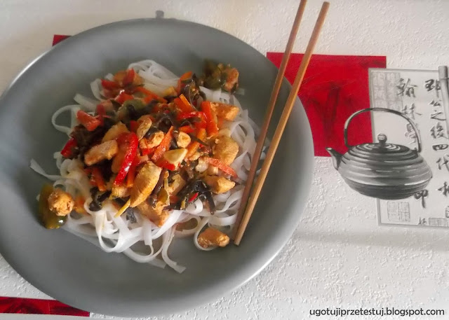 Kolejna odsłona chińskiej kuchni.Tym razem aromatyczny kurczak z makaronem ryżowym.Pyszne, lekkie i szybkie danie – idealne na obiad w upalny dzień.Warto trochę poeksperymentować w kuchni- gorąco Was do tego namawiam! 🙂