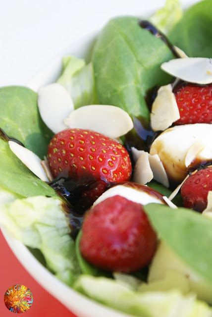 Lekka sałatka z truskawkami, mozzarellą, liśćmi szpinaku i prażonymi migdałami – idealna na upalne dni 🙂 Zapraszam do przygotowań!