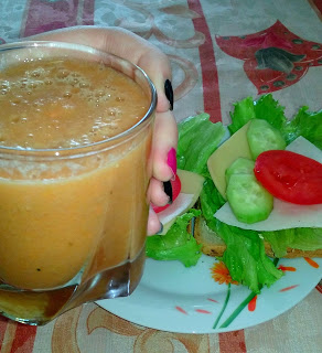 1. Owoce i marchewkę obrać i pokroić na mniejsze części. Zmiksować z dodatkiem wody.