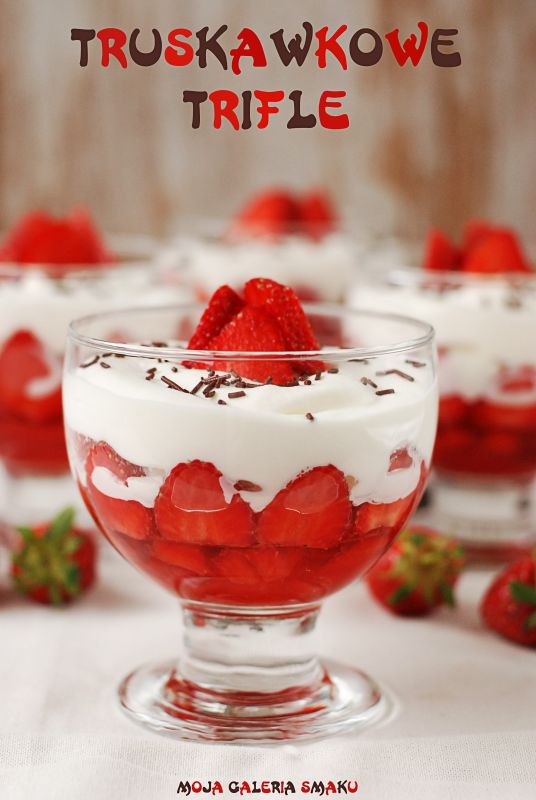 Pyszny, warstwowy deser wywodzący się z Anglii. Składa się z warstwy galaretki z truskawkami, biszkoptu nasączonego galaretką, budyniu (warto pokusić się o zrobienie go samodzielnie) oraz bitej śmietany. Przepis znaleziony u Doroty. Gorąco polecam!