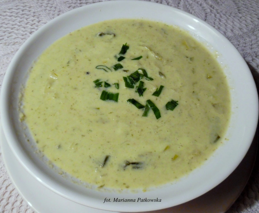 Ostatnim moim autorskim pomysłem, z którego jestem bardzo zadowolona, jest zupa „Zielona cebulka”. To delikatny, gęsty krem z zielonej cebulki, cebuli i pora z serową nutą. Pewną ciężkość zupy niweluje kminek, którego nie musimy dać zbyt dużo – nie jest wyczuwalny w smaku – jednak dobrze o nim
