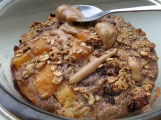 pieczona cynamonowa owsianka z morelami i świeżymi daktylami, podana z masłem orzechowym