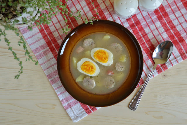 Pyszny żurek na domowym zakwasie z jajkiem, białą kiełbasą, boczkiem i odrobiną…