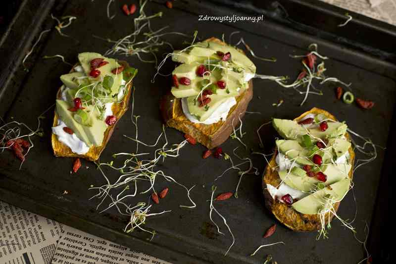 Pieczone bataty z awokado. Słodkie ziemniaki z dodatkiem awokado, jogurtu, granatu i…