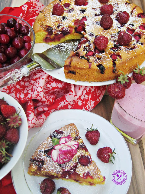 Zapach i smak lata zamknięty w cieście. To ciasto przypomina mi okres dzieciństwa, kiedy to skoro świt biegłam na pole aby narwać świeżych truskawek. Piękne jest wspomnienie przebijających się przez drzewa czereśni promieni słonecznych. Ciasto proste a jakie pyszne!