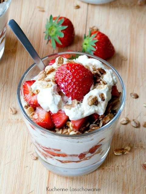 Świetny pomysł na śniadanie czy deser, ulubiona granola ze świeżymi owocami – np. truskawkami, malinami czy jagodami i jogurtem greckim. Wariacji na temat parfait jest wiele, ja zdecydowałam wypróbować ulepszoną wersję o mleczko kokosowe. Efekt znakomity, polecam.
