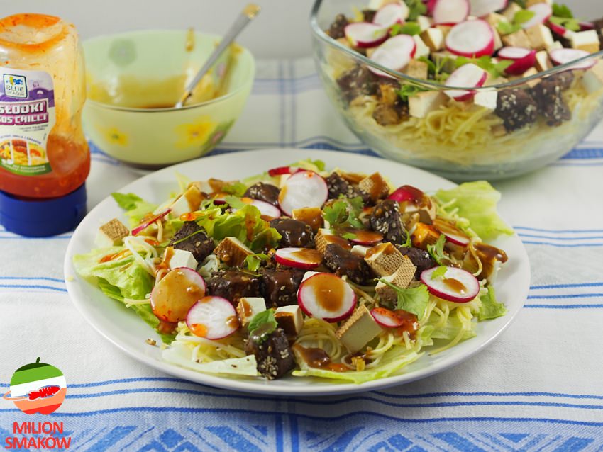 Bazą tej sałatki jest mięso z piersi kaczki i wędzone tofu. Do tego szeroka gama warzyw, orzechy i pyszne azjatyckie sosu –