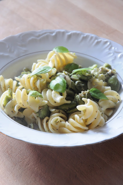 Makaron z bobem i wędzonym serem