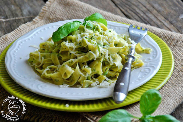 Odkąd kupiłam w Lidlu maszynkę do makaronu, jest on u mnie obowiązkowo raz w tygodniu. Przeważnie do rosołku, ale tym razem postanowiłam zrobić swoje własne tagliatelle. Bazylii w domu pod dostatkiem, więc pomysł tym bardziej godny do zrealizowania.