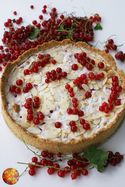 Pyszny, słodko-kwaśny placek bezowy na migdałowym spodzie z czerwoną porzeczką. Pyszności